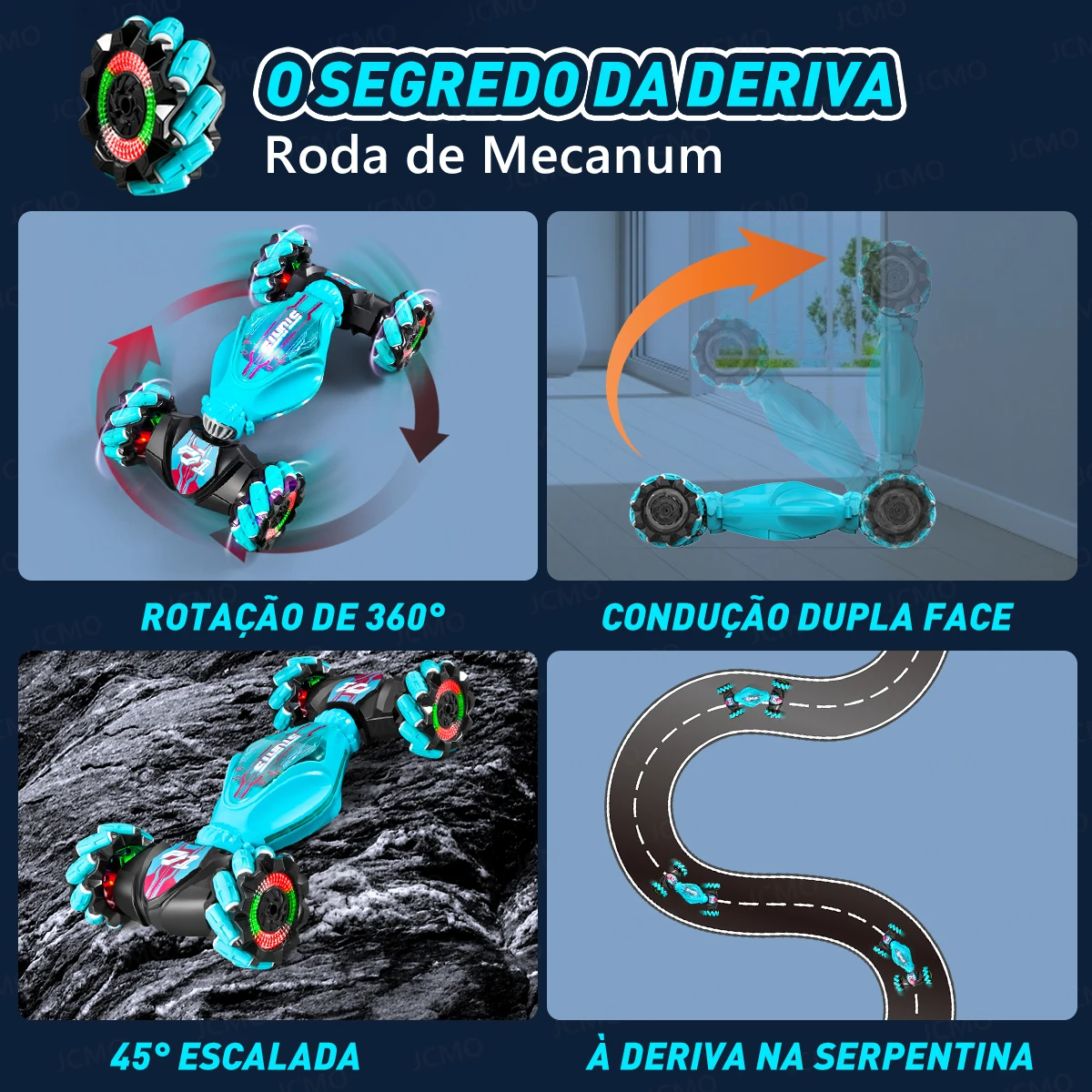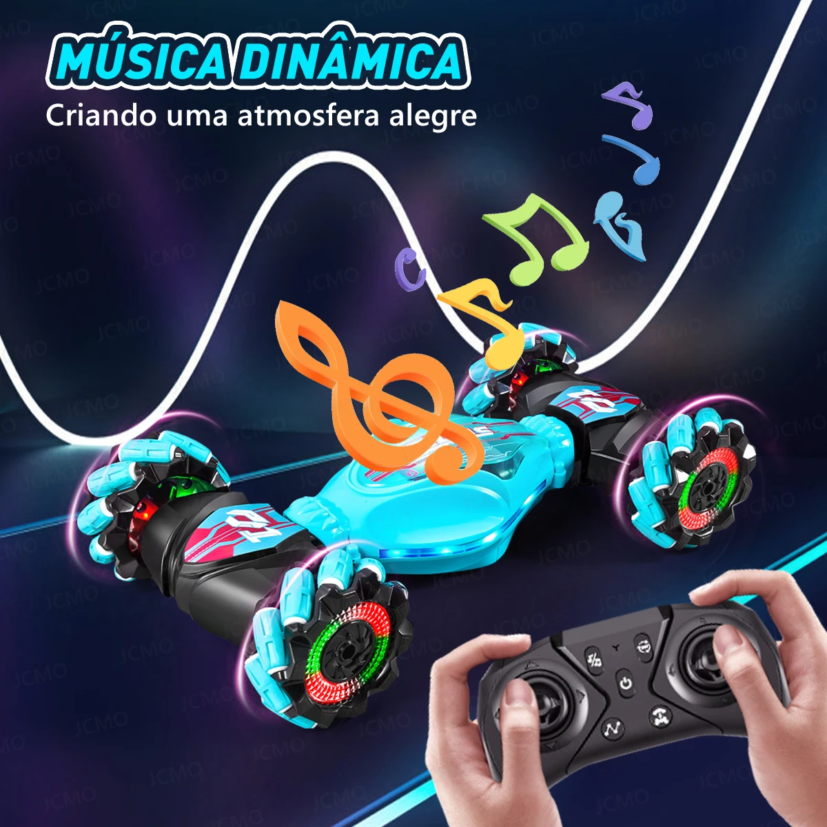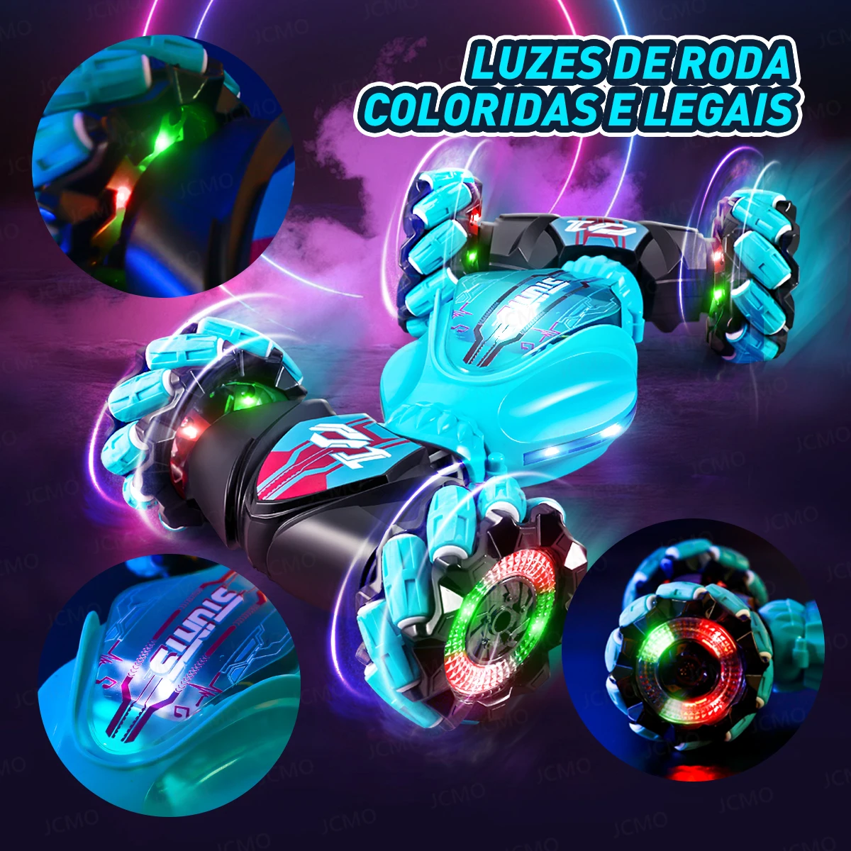 Este carro acrobático com controle remoto tem muitas funções, incluindo suporte para direção frente e verso, rotação de 360 graus, escalada de 45 graus e pode dirigir facilmente em estradas serpentinas. O formato também é único, com efeitos musicais e luminosos.