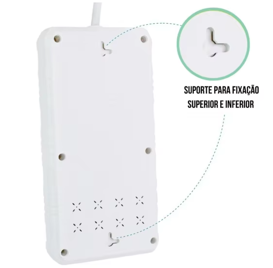 A extensão possui sistema de filtro de linha (sem fusível), que protege seus dispositivos conectados a ela, contra curto circuitos ou sobrecargas, desarmando rapidamente a extensão, isso é segurança e eficiência. Há também, dois orifícios na parte de trás do produto, para que você possa fixá-lo a parede.