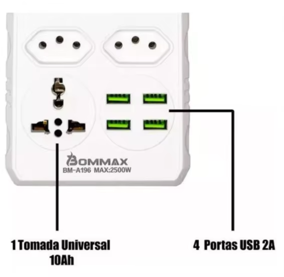 A extensão possui ainda, 4 portas UBS de 5 Volts, para você carregar seus dispositivos atráves dessa forma de carregamento moderna.