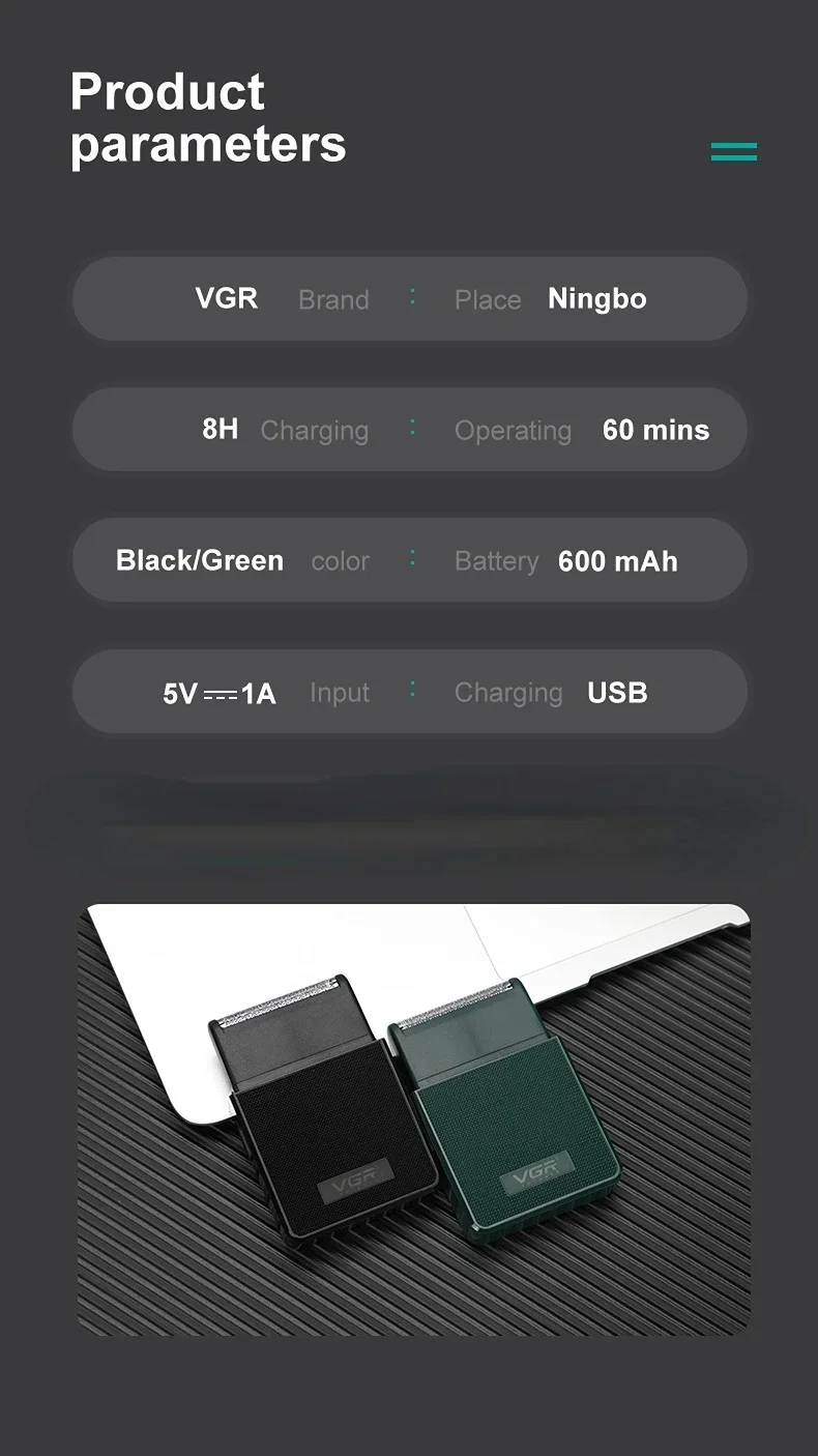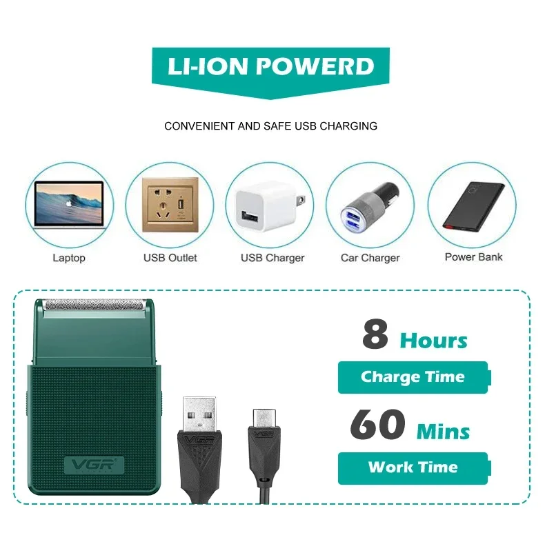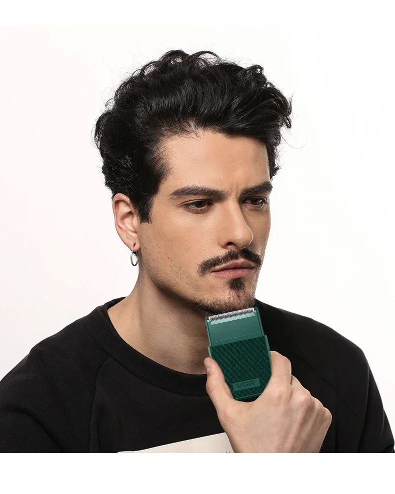 O mini barbeador VGR possui um design elegante e compacto, tornando-o um companheiro de viagem ideal. Sua construção leve garante portabilidade sem esforço, permitindo que você mantenha sua rotina de higiene onde quer que a vida o leve.