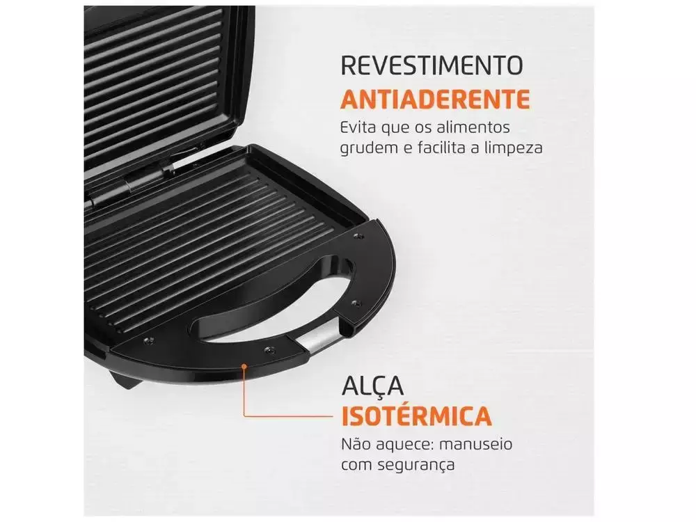 Composição: Antiaderente, Alça Isotérmica, Trava de Fechamento, Lâmpada Piloto, Controle de Temperatura Automático